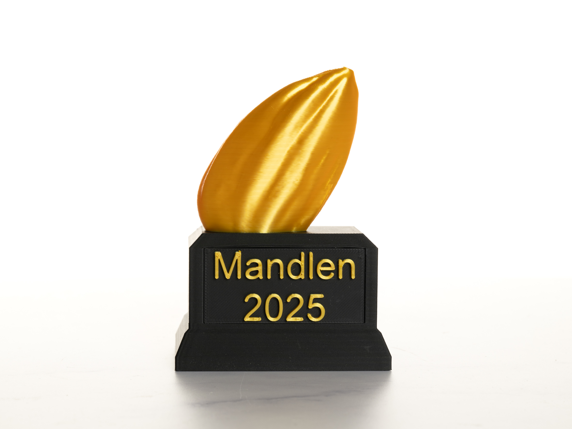 En flot statue med en guld mandel, og teksten Mandlen 2025 også i guld