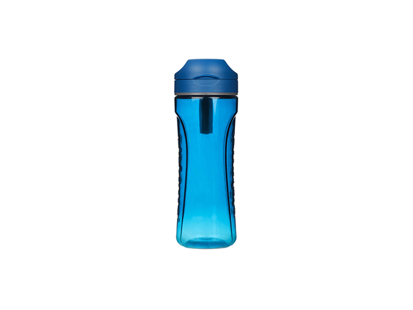 Den har et tætsluttende låg, som forebygger lækage, hvis låget er lukket helt tæt. Der er påmonteret grå silikonestrop i låget til at holde flasken i.